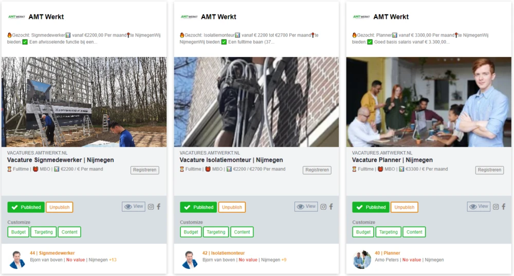 Met Booston zijn meerdere recruitment-campagnes mogelijk. Naast een ijzersterk vacaturebank-netwerk kunnen vacatures in een handomdraai gepubliceerd worden als advertentie op Facebook & Instagram. De social-media-module van Booston is uniek. Deze module zorgt voor meer kandidaten, bespaart tijd en optimaliseert de snelheid van het recruitmentproces.
