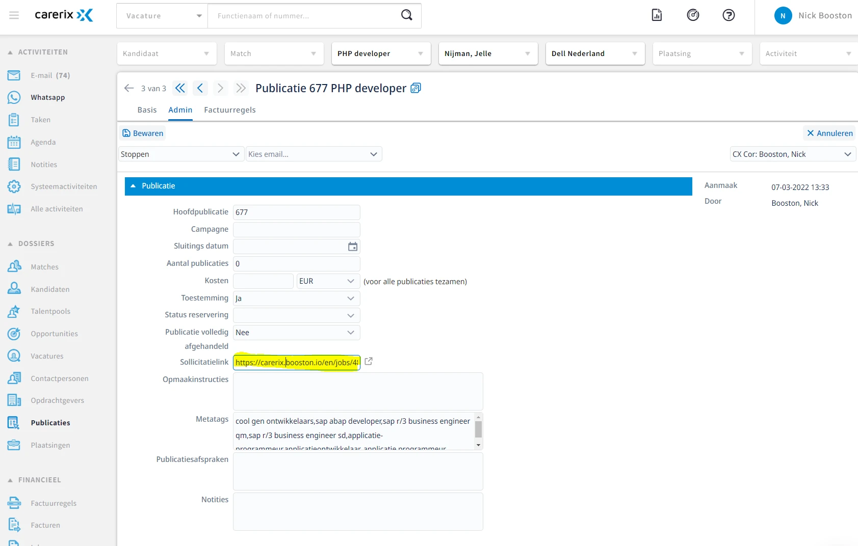 Of controleer Carerix via de publicatie op het tabblad 'Admin'. We zullen hier ook de vacature-URL terugplaatsen: