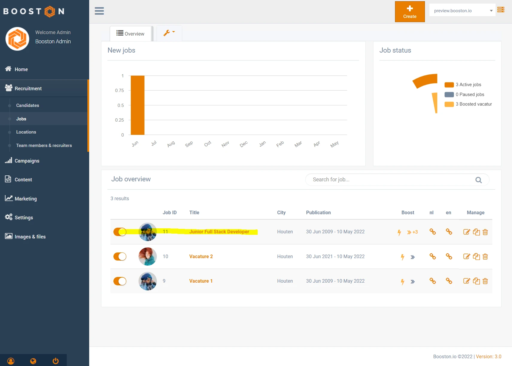 - Publiceer ten minste 1 vacature (per taal) naar Booston. Meer informatie over hoe je dit doet, vind je in dit artikel in de sectie 'Vacatures plaatsen en kandidaten ontvangen'.