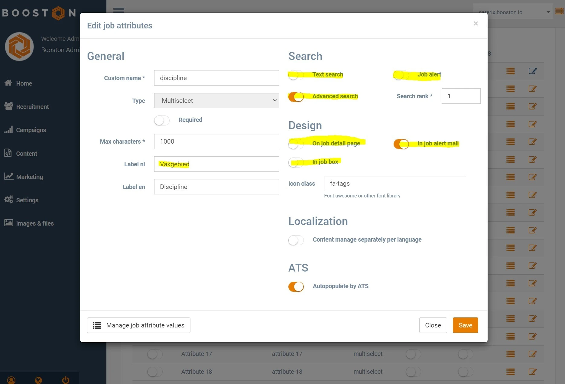 Welke attributen wil je importeren? Als je een attribuut op (1) inactief zet, zal dit niet actief zijn in Booston en zullen wij de gekoppelde waarde niet importeren. Als je wil dat ATS Easyflex de informatie invult, zet dan ‘automatisch invullen door ATS’ aan. Als het attribuut actief is, maar ‘automatisch invullen door ATS’ is uitgeschakeld, kan je op elk moment handmatig inhoud toevoegen in Booston via recruitment > vacatures > vacature bewerken > respectief attribuut bewerken. Bewerken van het attribuut.