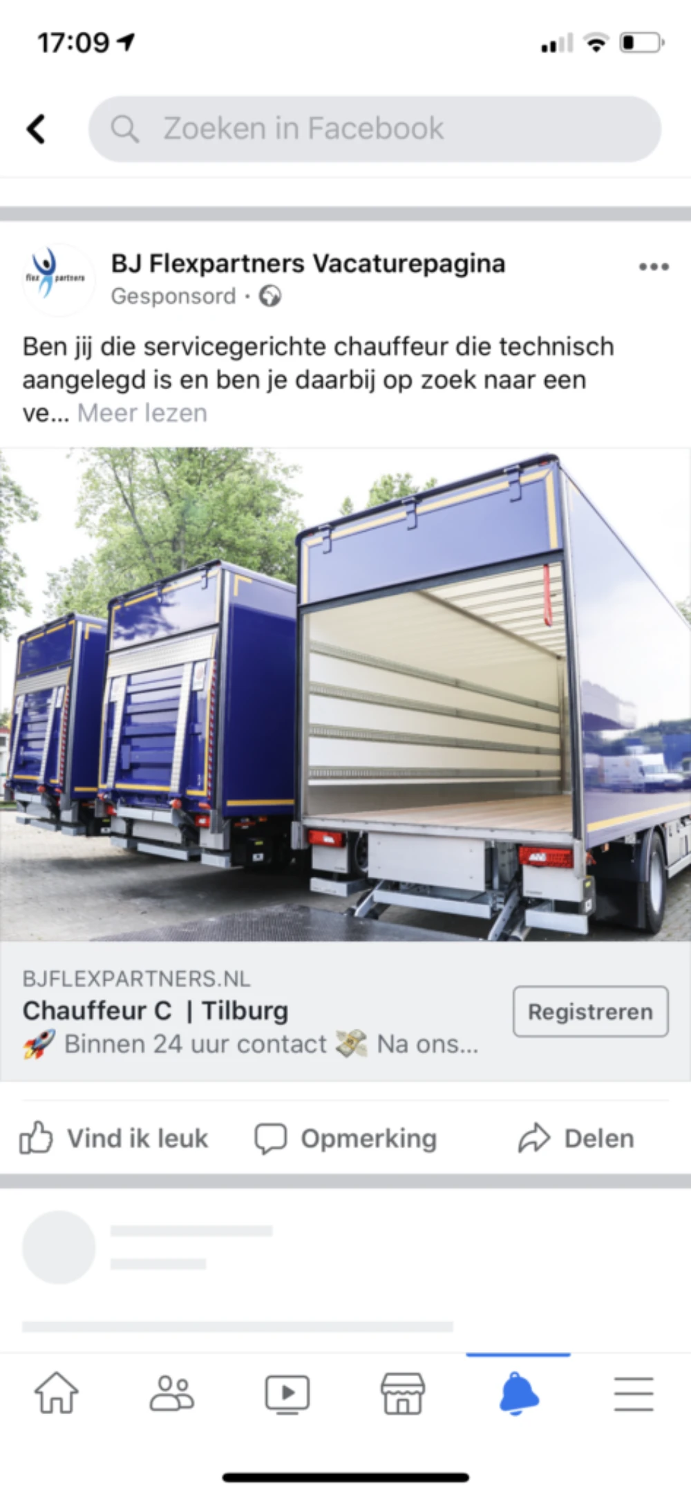 In onderstaande voorbeelden zie je hoe de getargete chauffeur in regio Leerdam deze advertentie te zien kreeg (foto 1, 2 & 3). Na doorklikken op ‘reageer’ wordt er in Facebook een mini-sollicitatieformulier getoond (foto 4). Dit formulier bevat een aantal concrete beloftes en voorwaarden aangaande de ‘mini-sollicitatie’. Uiteraard wordt e.e.a. nu gepersonaliseerd naar de recruiter van de vacature toe. De uitgevraagde informatie is al ingevuld. Immers, dit is informatie die al bekend is bij Facebook of Instagram.