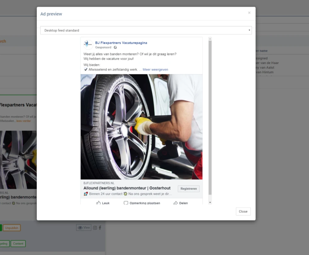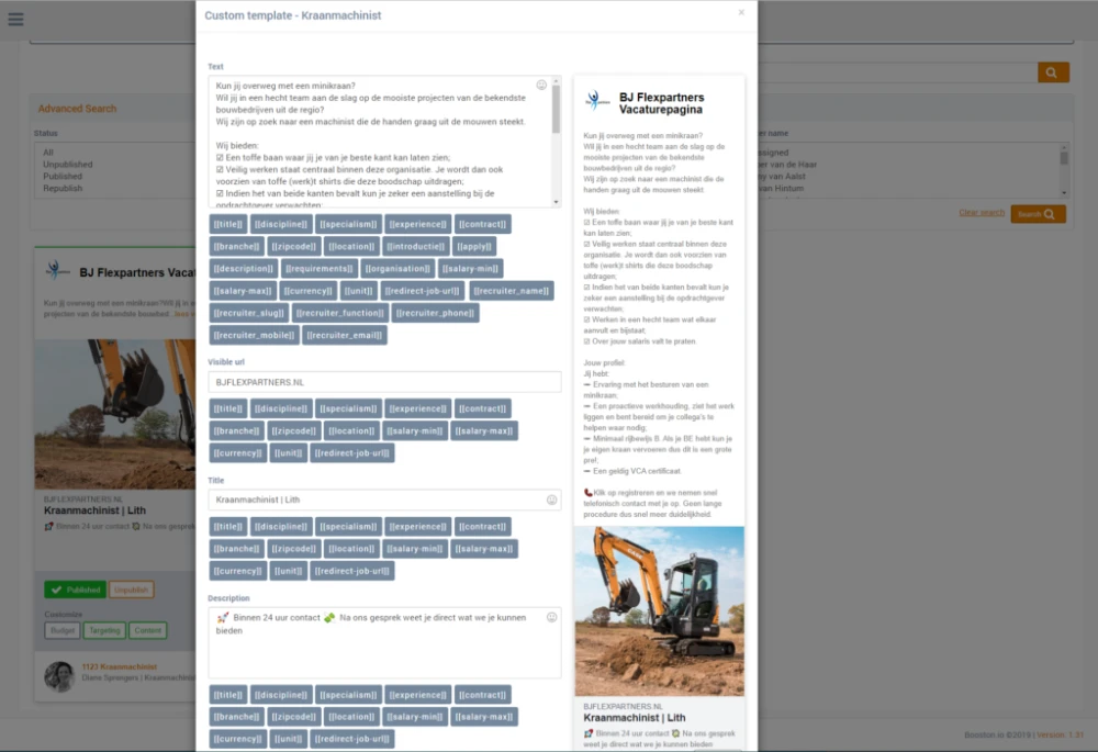 Daarna werd de social campagne voor BJ Flexpartners ingericht. Resultaat? Sociale job ads staan voor 95% gereed om te publiceren. Volledig voorzien van beeld, (hyper)targeting en teksten. Gekoppeld aan eigen social media pagina’s. En volledig toegespitst op de betreffende vacature. In het geval van BJ flexpartners zijn dit er op moment van schrijven honderd vacatures; automatisch gecreëerd. Dát scheelt veel tijd.