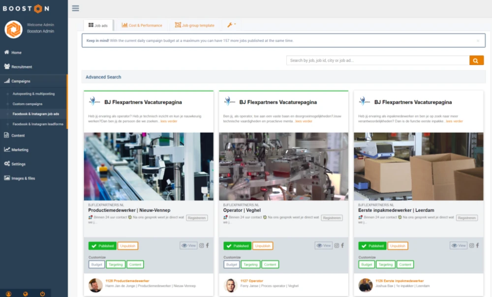 De omschrijving van deze uitdaging was ook herkenbaar voor BJ Flexpartners. Booston mocht helpen de social media campagne te stroomlijnen met haar campagneautomatisering voor social vacature ads.