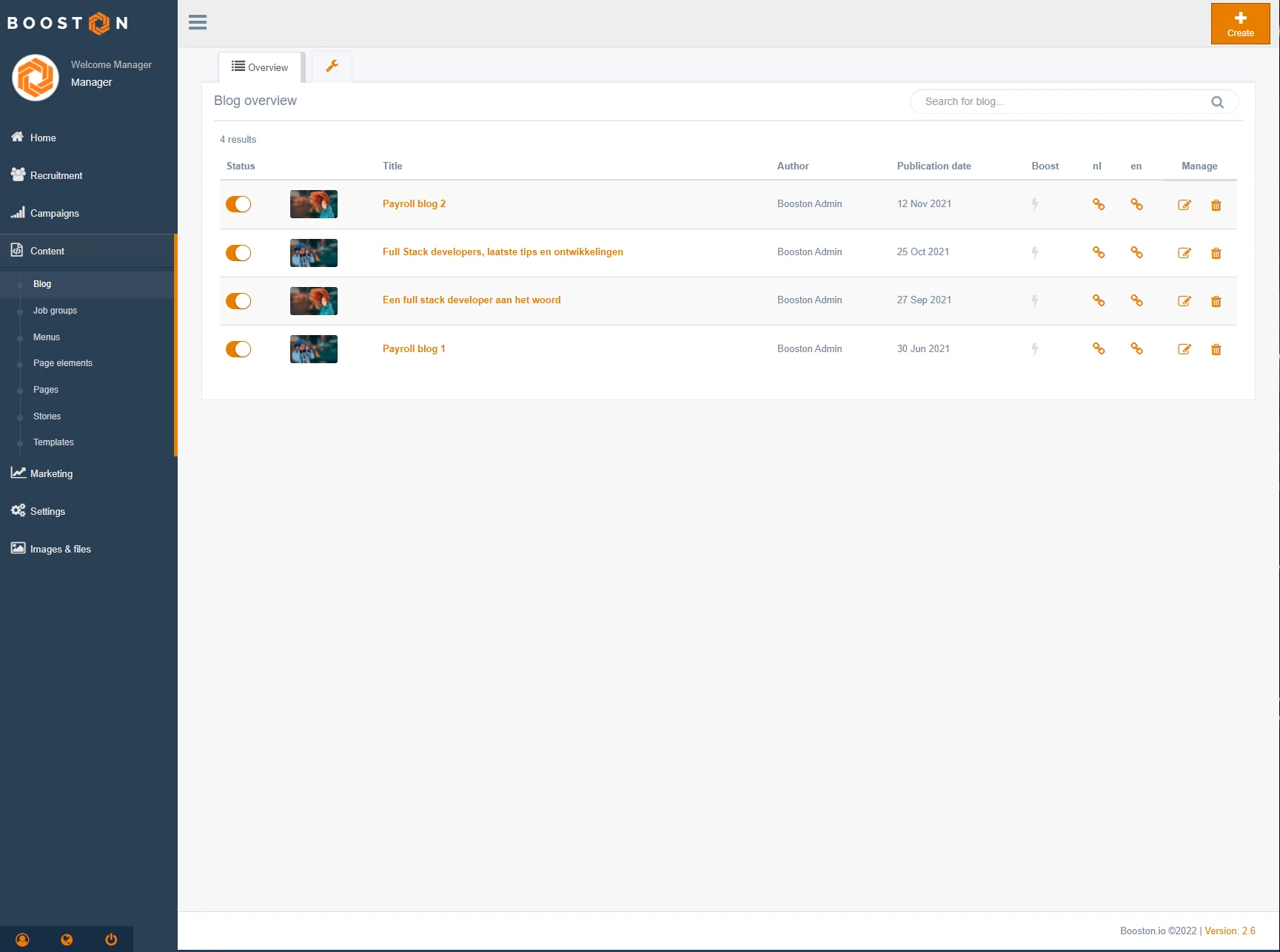 In deze stap ga jij een blog aanmaken. Heb jij al één of meerdere blogs op je Booston recruitment website? Ga direct naar 3.1.