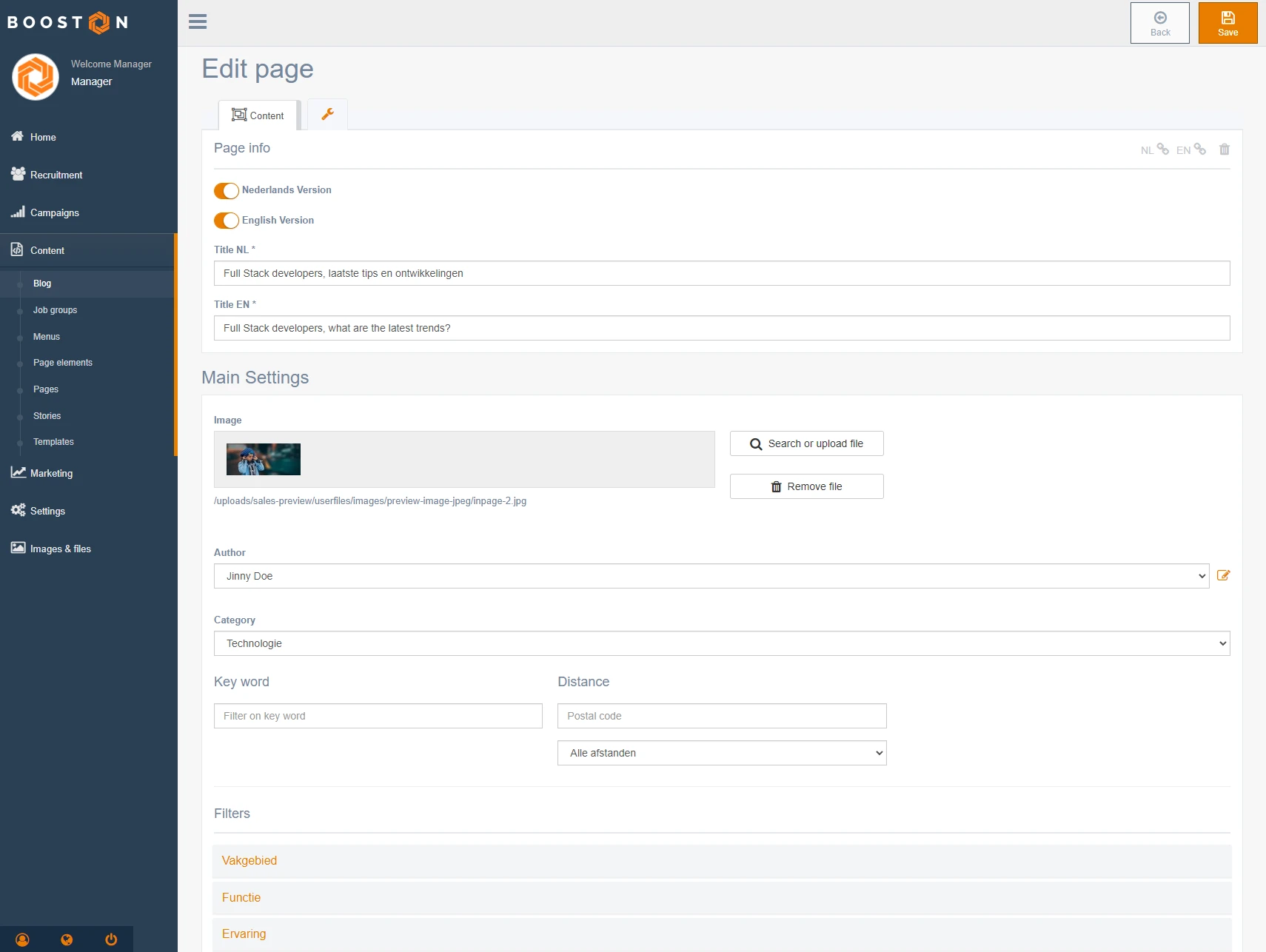 Als eerst de page info, hier kan jij een titel invoeren, een foto toevoegen, een auteur selecteren, een blog categorie selecteren en keywords toevoegen. Voer een titel in die relevant is voor de doelgroep en die er voor zorgt dat jouw blog makkelijk te vinden is op de recruitment website en het internet. Wanneer jij alle page info hebt toegevoegd is het tijd om de blog te schrijven. Dit kan jij eenvoudig doen door in de main content de tekst en eventuele foto’s of video’s toe te voegen.