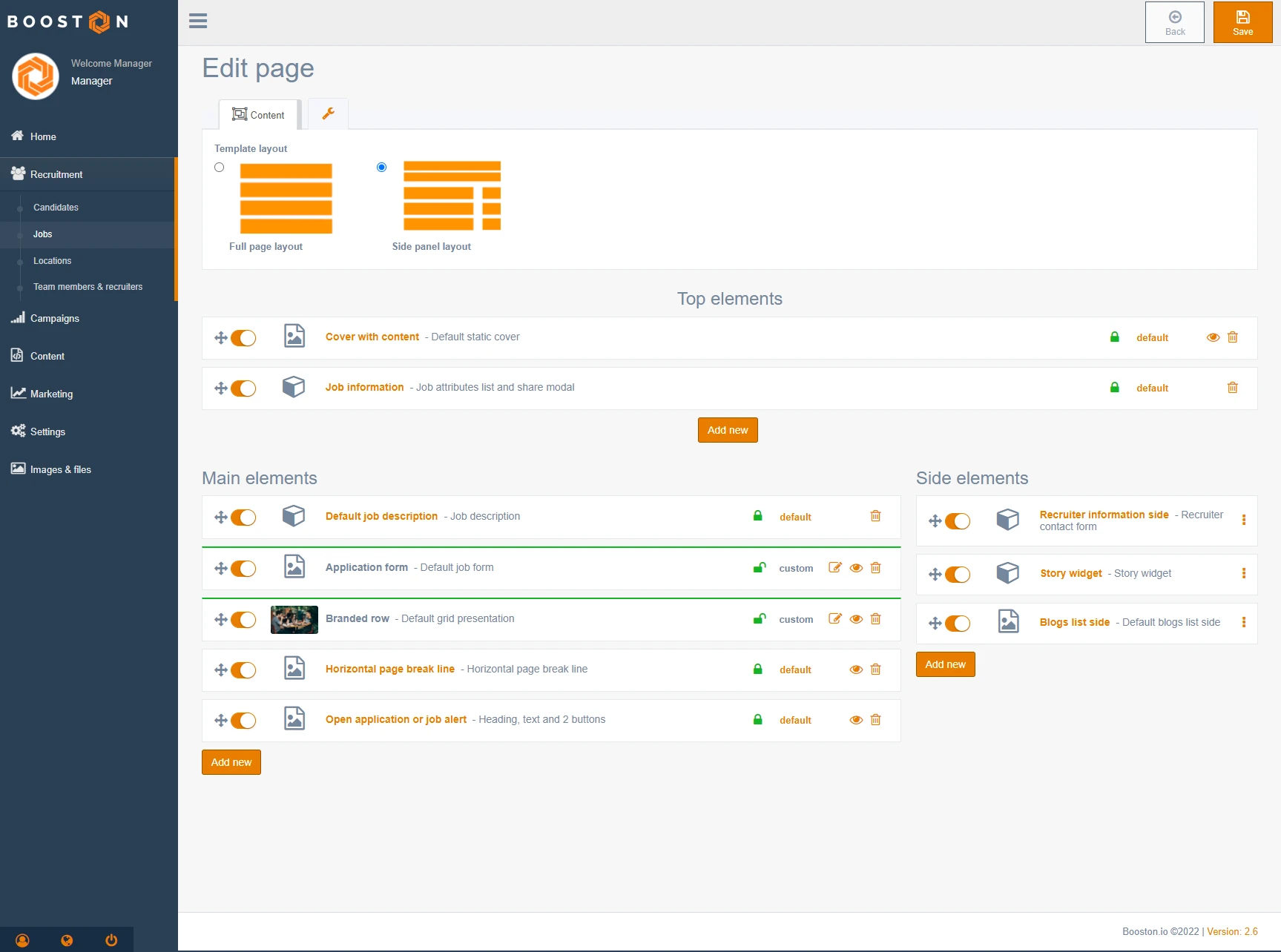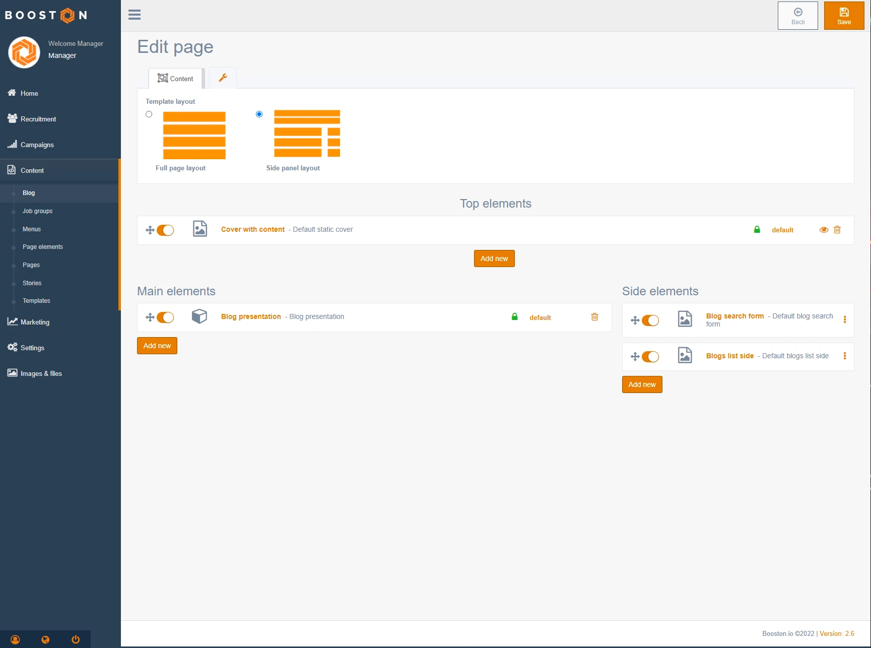 Ben jij klaar met alle bovenstaande stappen? Dan kan jij nu beginnen met het opzetten van de blog- en vacaturepagina’s. Check of alle stappen correct zijn uitgevoerd voor het opzetten van de pagina’s. Zonder de juiste instellingen en gekoppelde attributen zullen de features namelijk niet werken. Daarnaast moeten alle pagina’s beschikken over side elements, kies dus voor een side panel layout.