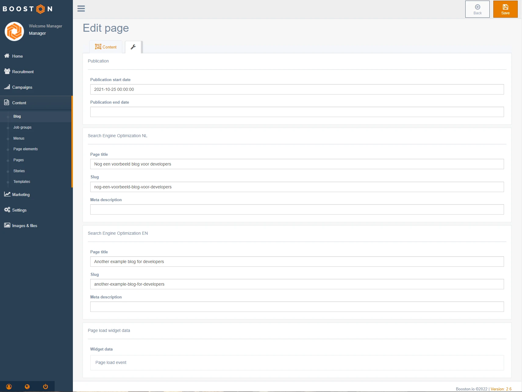 Naast het feit dat jij nu blogs kan tonen op relevante plekken, wil jij ook meer traffic naar jouw recruitment website genereren. Geen probleem! Met de Booston blog features kan jij gemakkelijk relevante titels en meta descriptions toevoegen zodat jij beter te vinden bent op zoekmachines.