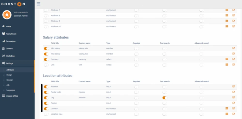 In het menu settings > attributes en dan onder het kopje ‘location attributes’ activeer je ‘adress’ t/m ‘country’ door de meest linker schuifjes actief (oranje) te maken. Ziet het er uit zoals in het plaatje hierboven? Top, dan worden deze gegevens bij het aanmaken van een nieuwe vacature correct doorgegeven aan Google. Alleen het veld ‘country’ moet nog even een kleine behandeling krijgen. Dat doe je zo: