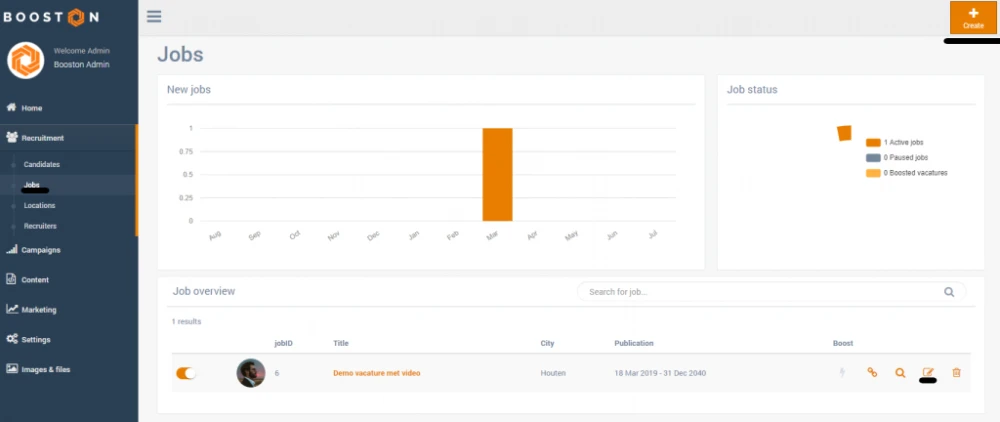 - Open een bestaande vacature via Recruitment > Jobs klik vervolgens op de edit button om een vacature aan te passen.