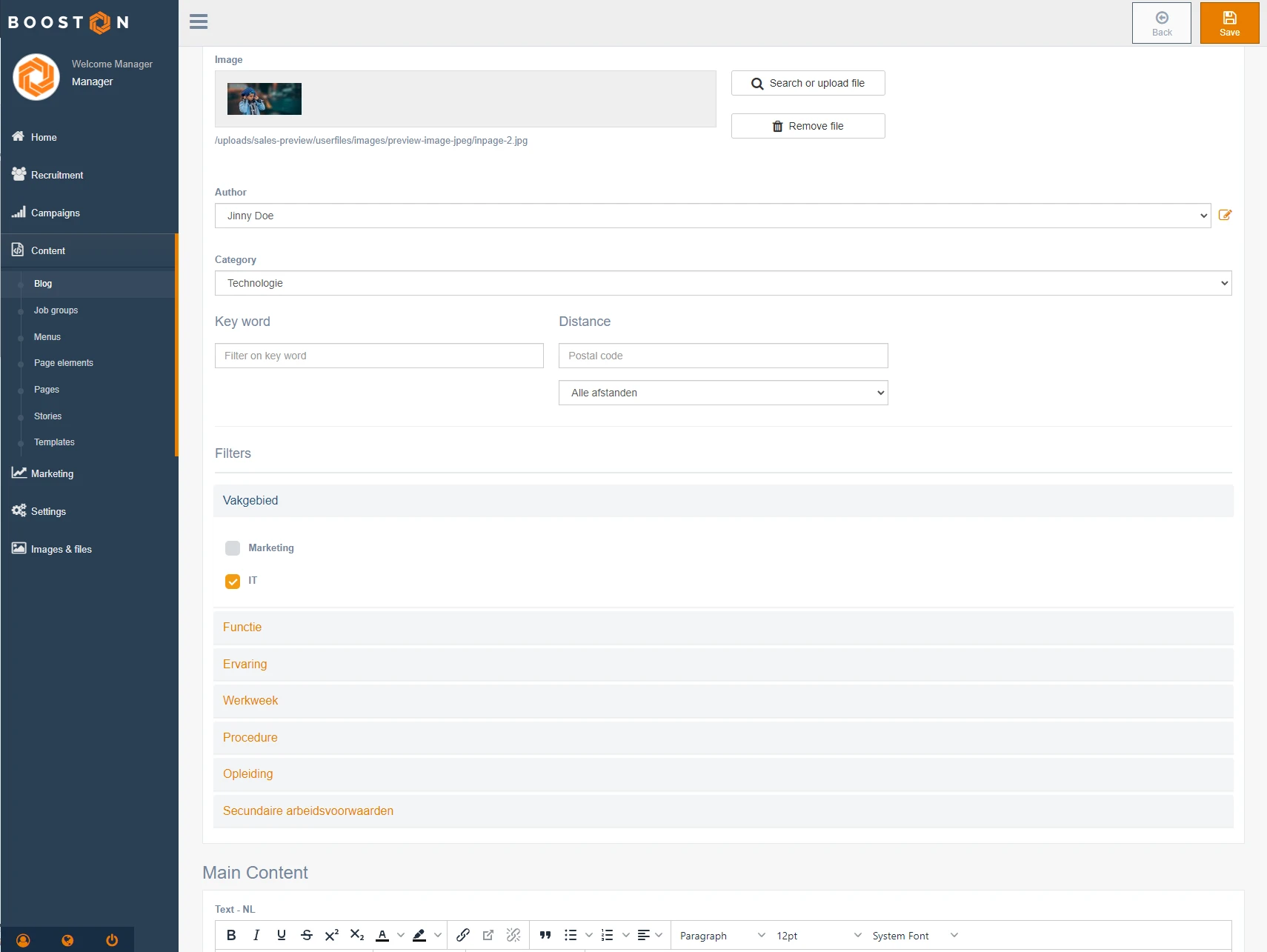 Als eerst de page info, hier kan jij een titel invoeren, een foto toevoegen, een auteur selecteren, een blog categorie selecteren en keywords toevoegen. Voer een titel in die relevant is voor de doelgroep en die er voor zorgt dat jouw blog makkelijk te vinden is op de recruitment website en het internet. Wanneer jij alle page info hebt toegevoegd is het tijd om de blog te schrijven. Dit kan jij eenvoudig doen door in de main content de tekst en eventuele foto’s of video’s toe te voegen.
