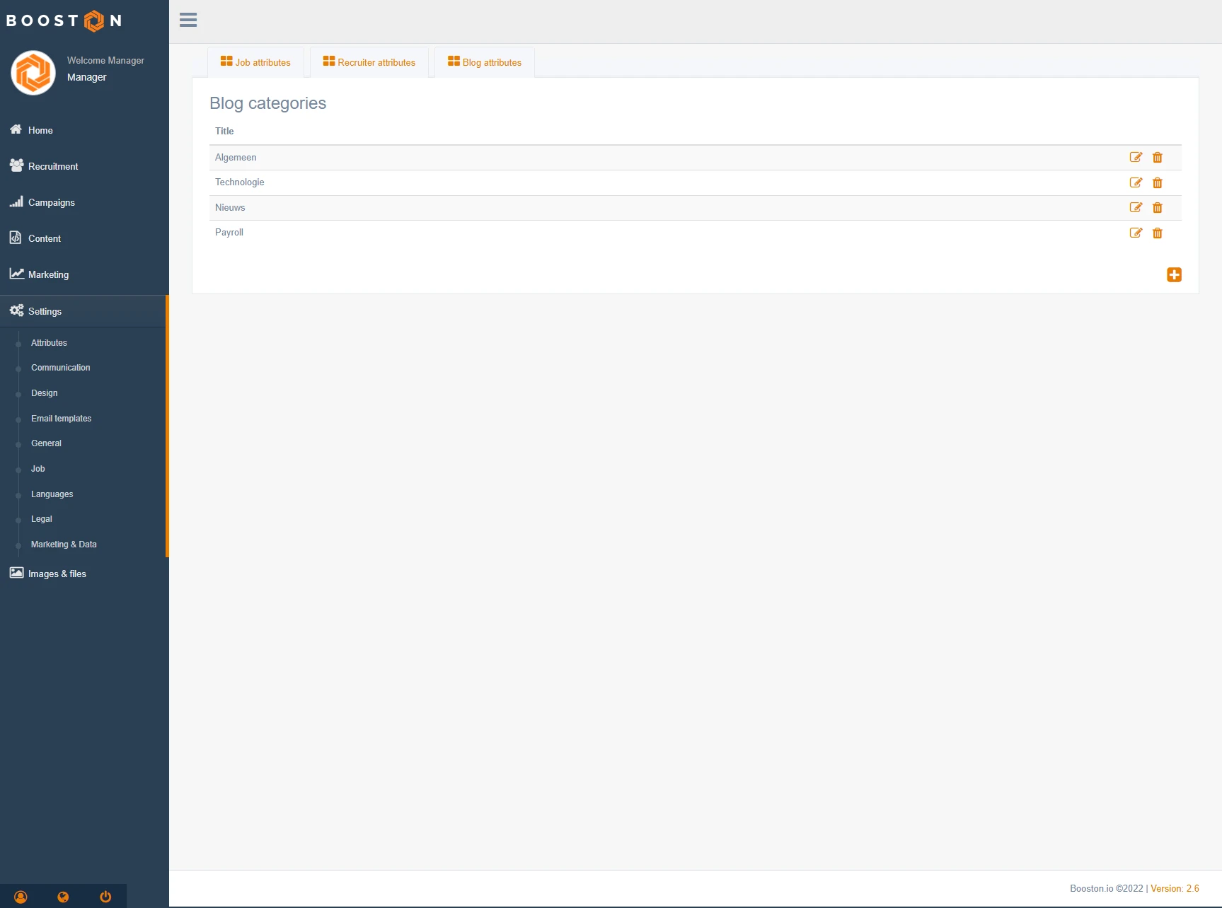 Open de Booston backend, ga naar settings > attributes en selecteer vervolgens blog attributes. In dit menu kan jij gemakkelijk branches of categorieën toevoegen. Door deze attributen toe te voegen, creëer jij tags waar jij blogs aan kan koppelen. Dit zorgt ervoor dat relevante blogs gemakkelijk kunnen worden gevonden op jouw recruitment website.