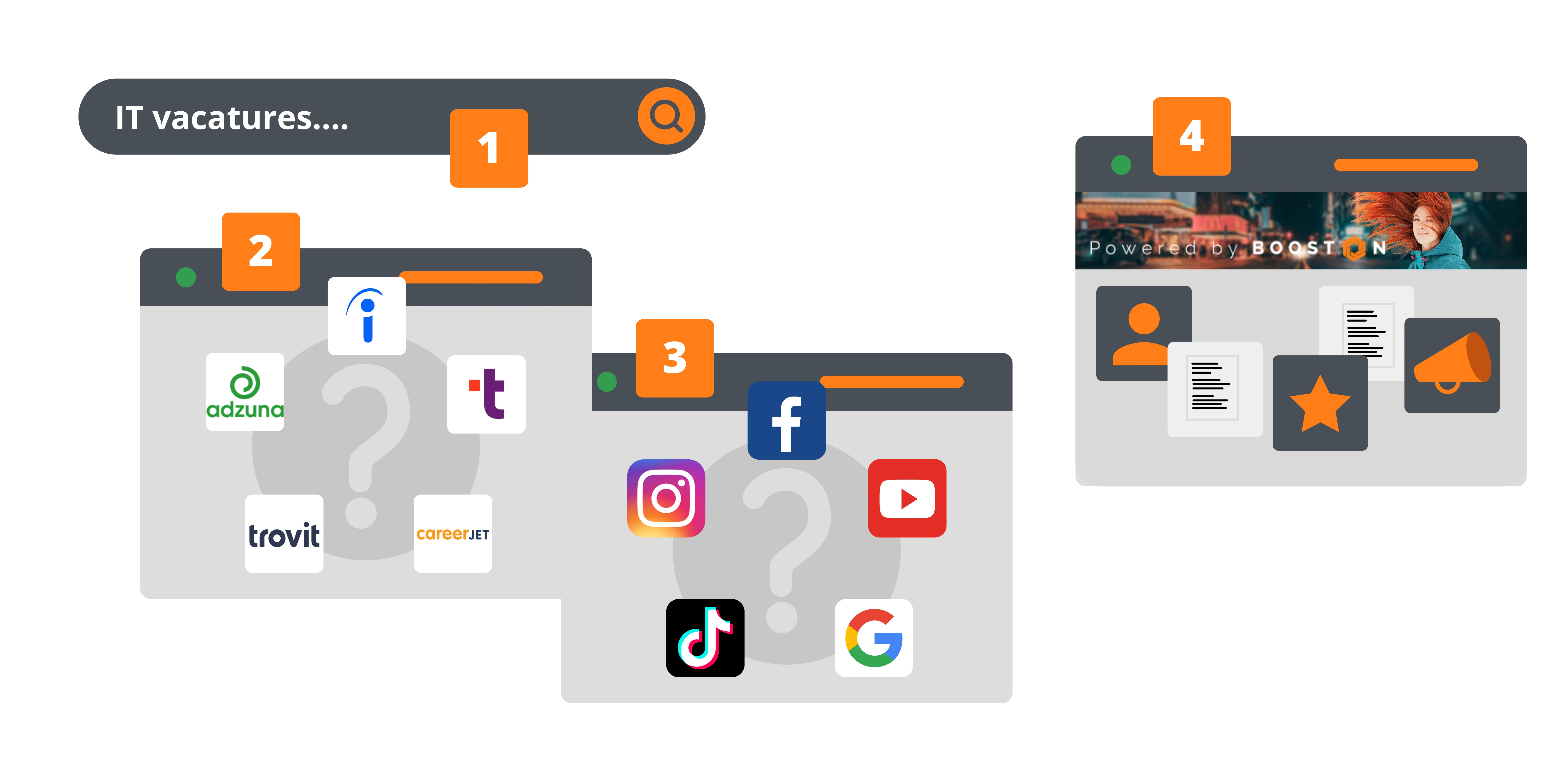 - Stap 2 – Mogelijke landingspagina’s: Hier vindt de kandidaat vacatures op jobboards, werkbij-sites en Job Ads (bijvoorbeeld Google 4 Jobs) (85%-51%).