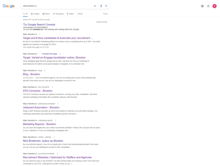 Benieuwd hoe jouw meta descriptions eruit zien? Ga naar google.com en zoek naar: “site:domeinnaam.nl”. Dus: site:booston.io geeft als resultaat:
