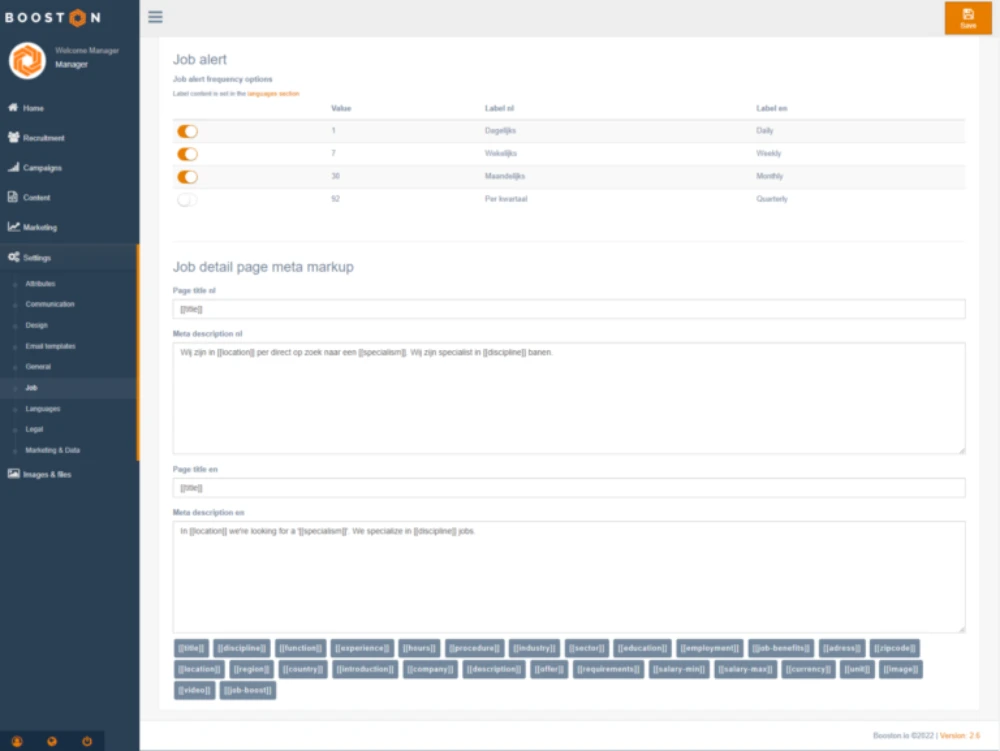 Ga naar settings > job en scroll naar beneden. Hier vindt jij het template. Pas hier de titel aan en meta description. Werk met de [[codes]] die onder het tekst vak worden getoond. Op deze manier erven alle meta descriptions de gewenste informatie van de vacatures over: titel, specialisme, industrie of functie.