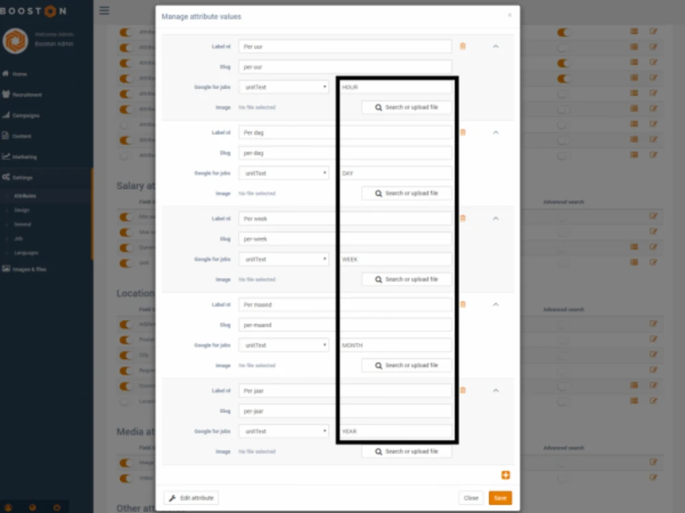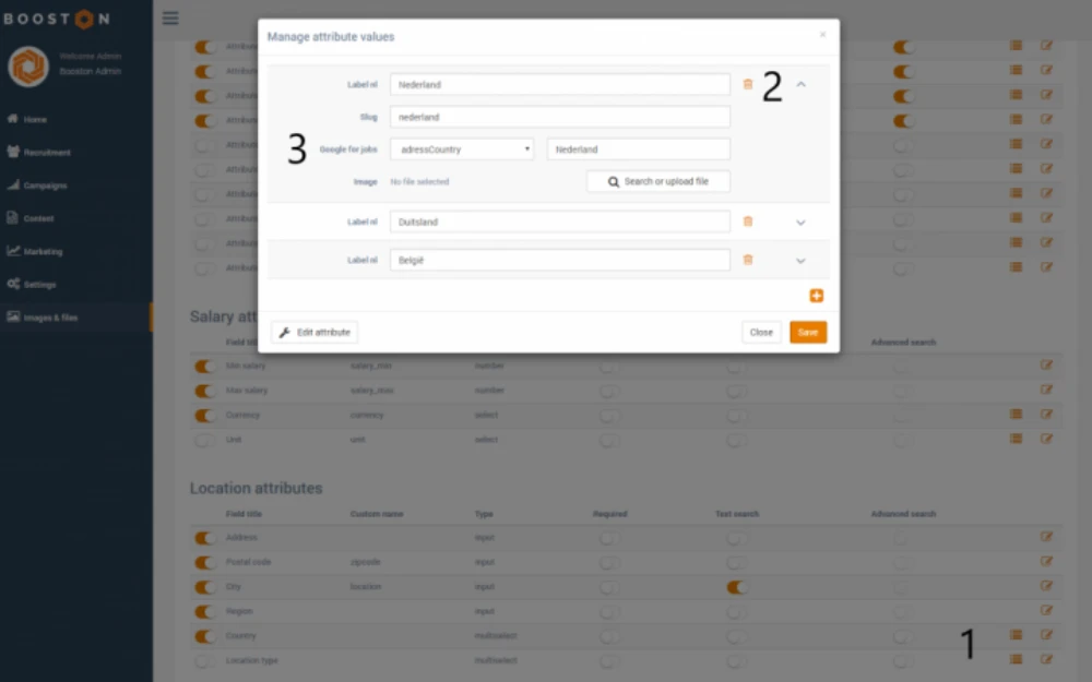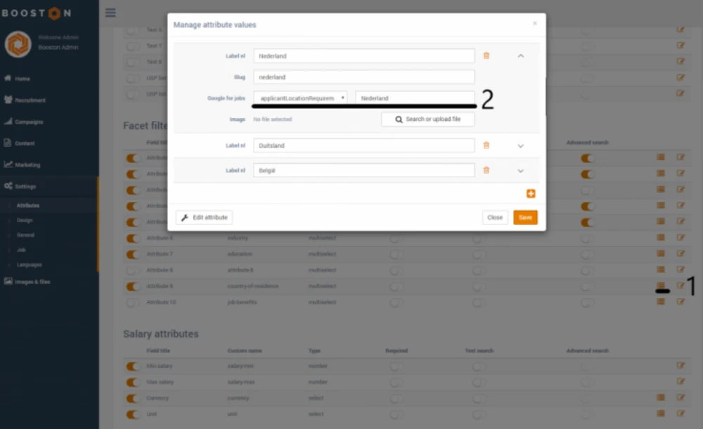 In het menu settings > attributes en dan onder het kopje ‘location attributes’ activeer je ‘adress’ t/m ‘country’ door de meest linker schuifjes actief (oranje) te maken. Ziet het er uit zoals in het plaatje hierboven? Top, dan worden deze gegevens bij het aanmaken van een nieuwe vacature correct doorgegeven aan Google. Alleen het veld ‘country’ moet nog even een kleine behandeling krijgen. Dat doe je zo: