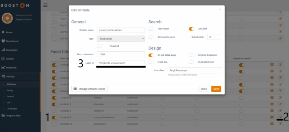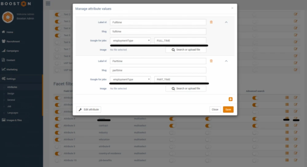 8. Locatie instelling ‘woonlocatie van de kandidaat’: Is het zo dat jullie vacatures beheren waarbij je Google for jobs wilt laten weten dat kandidaten alleen kunnen reageren wanneer ze uit een specifieke regio komen? Dan is deze laatste stap van belang. Zo zijn er bijvoorbeeld intermediairs die graag in contact komen met vaklieden uit een specifiek land zoals Polen. De daadwerkelijke werklocatie is echter in Nederland. In dat geval dient een nieuw attribuut te worden aangemaakt onder het kopje “Facet filter attributes”. Pas hiervoor een bestaand niet actief attribuut aan. In het voorbeeld hieronder is dat attribuut 9. Dit kenmerk hernoemen we ‘Verplichte woonlocatie?’