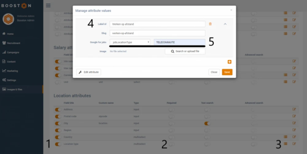 Middels het hamburgermenuutje (3) dien je de waarde ‘Werken op afstand’ (4) (of beschrijving die je zelf prettig vindt) toe te voegen. Na opslaan open je de waarde opnieuw en voeg je bij Google for jobs bij de attribuut-waarde ‘Werken op afstand’ “TELECOMMUTE” (hoofdlettergevoelig) toe (5).