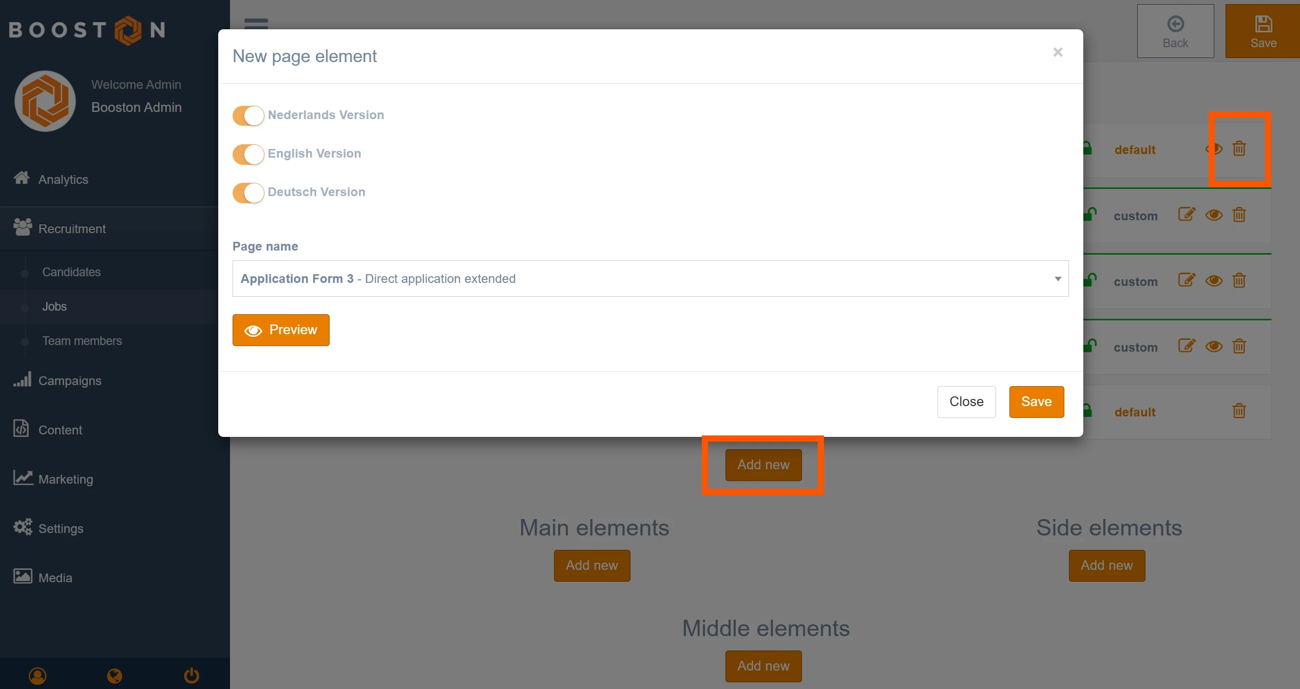 Remove the old application form from the page. Click Add new and add the element "Application Form 3 – Direct application extended" to the page.