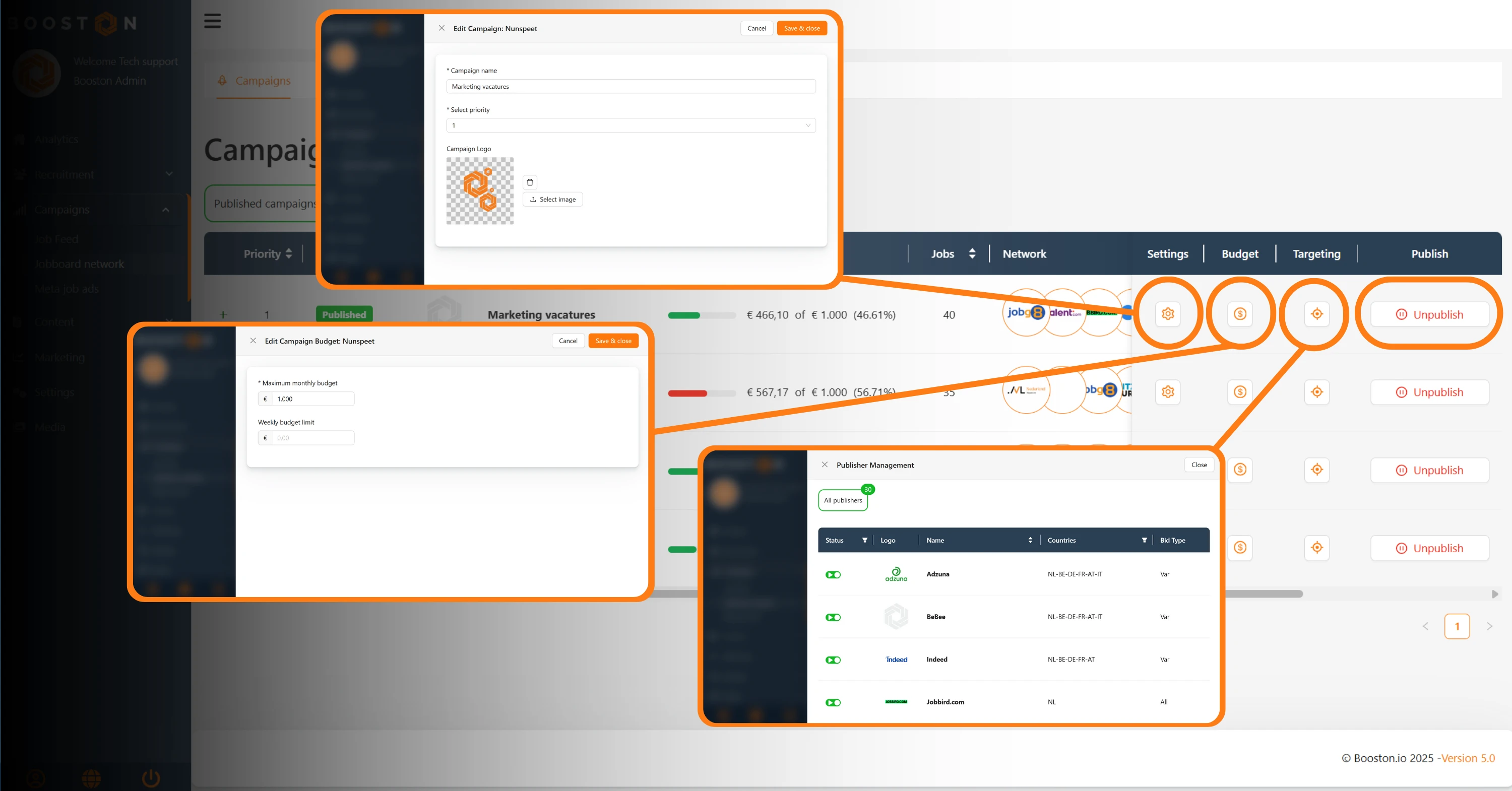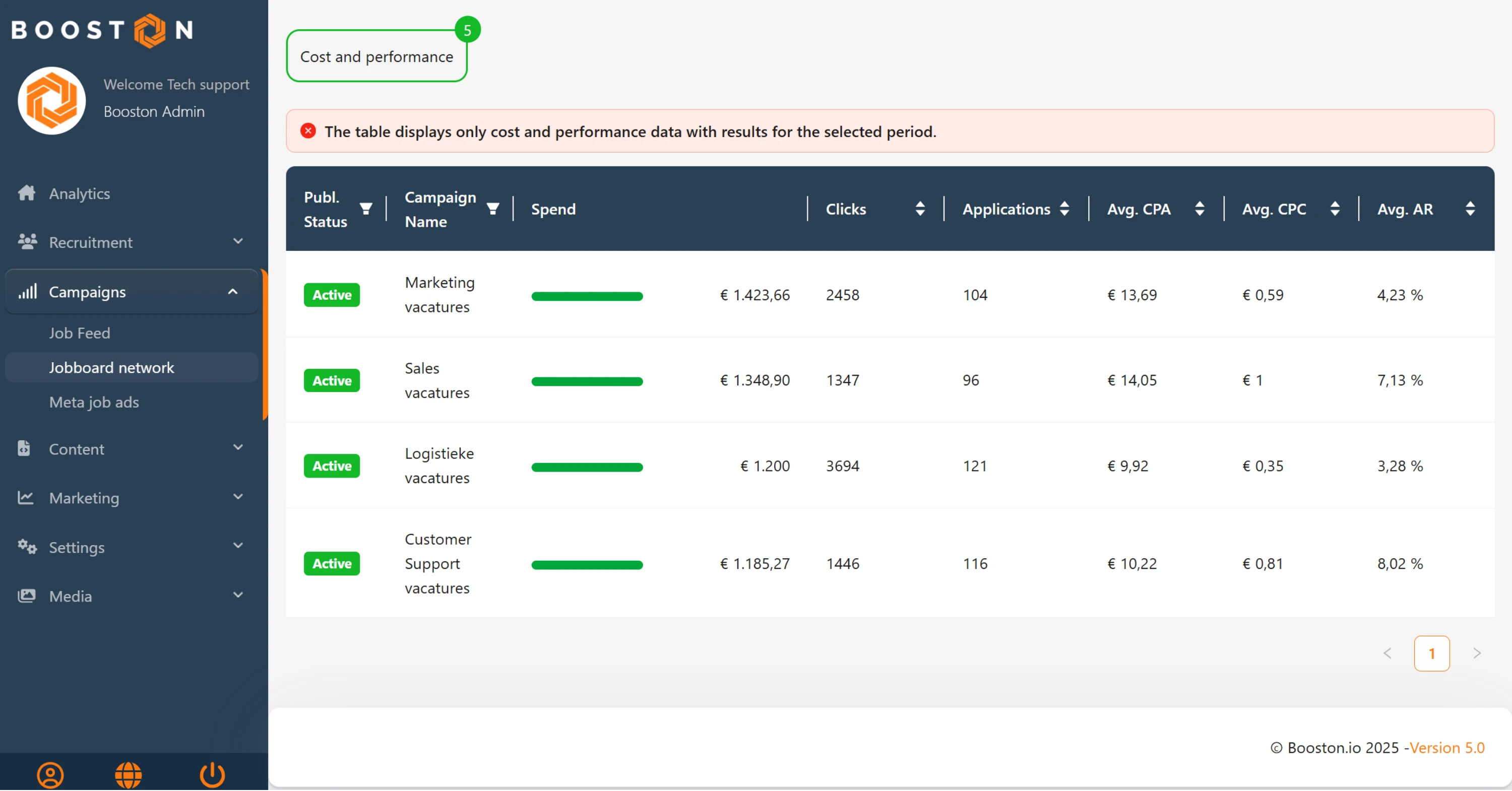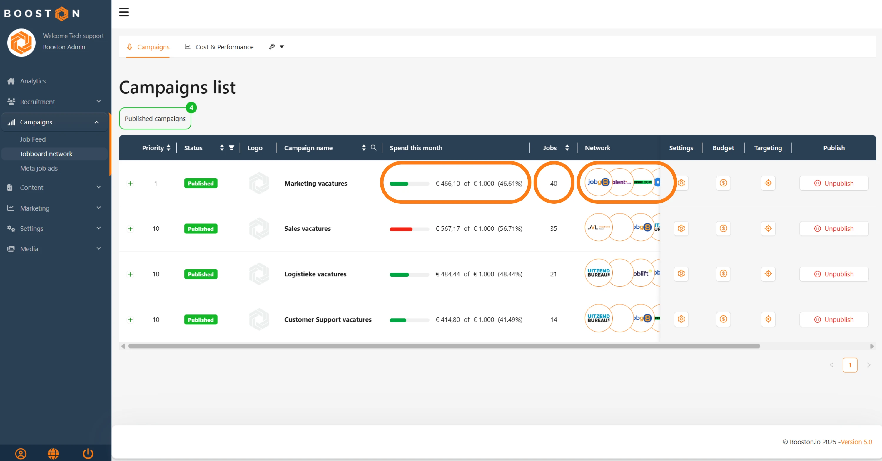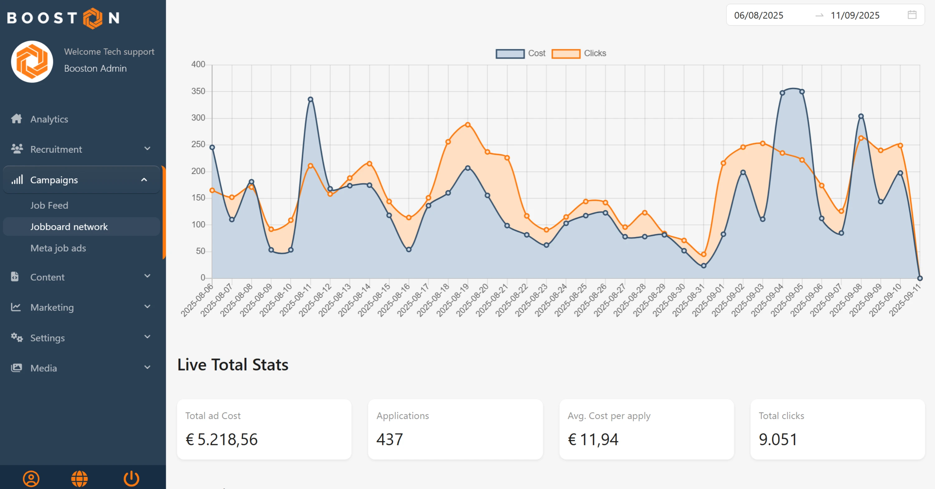 With Booston’s job boards module, you manage all your paid job postings centrally. In this article, you will learn how the module works, how to set up campaigns and define budgets, and how to analyze and optimize performance using our dashboards. This lets you extract more value from every euro spent and maintain control over your recruitment campaigns.